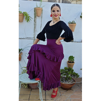 Flamenco dance skirt in eggplant-colored silk jersey fitted above the knee with a ruffle at the bottom that goes up diagonally in front.