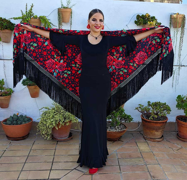 Mantón En Pico Negro Lunares Rojos Con Flecos Rojos Doble Tejido