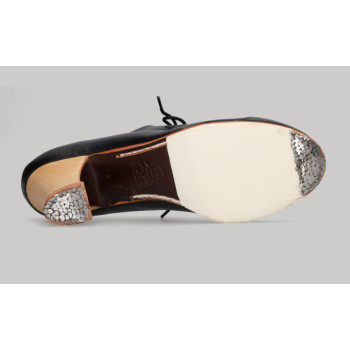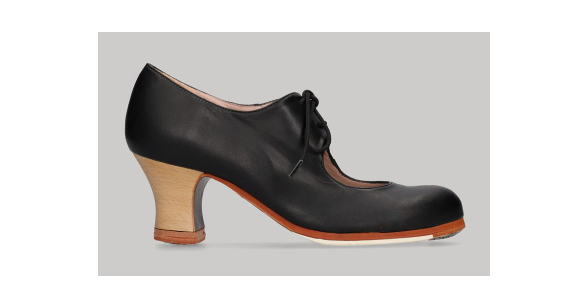 Zapato de baile flamenco profesional en piel negro con cordones, suela cosida y filis antideslizante.
