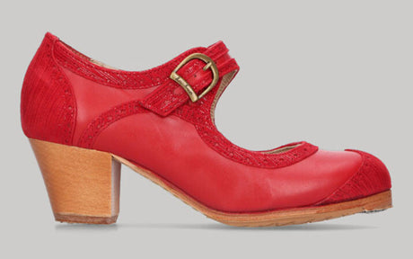 Zapato de Baile Flamenco Profesional Combinado Piel Rojo y Fantasía con Tacón Cubano