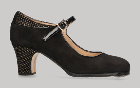 apato de baile Flamenco Profesional Combinado en Ante Negro y Fantasía con Hebilla