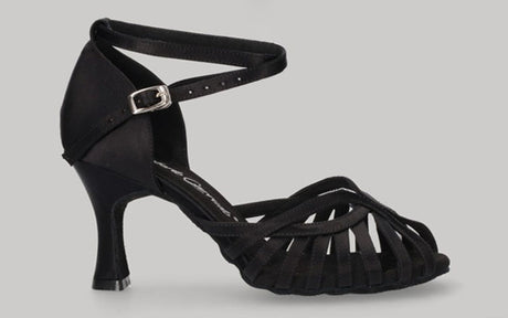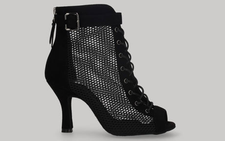 Black ankle boot style shoe for ballroom and tango dancing with rhinestone fringe