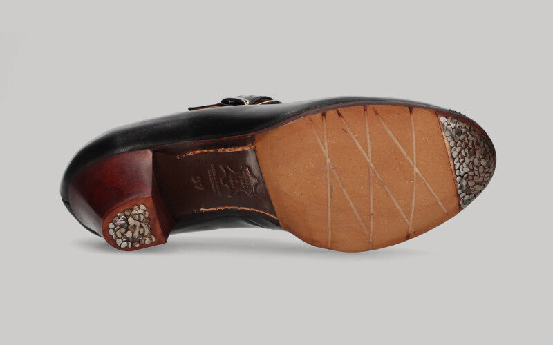 Professional black leather flamenco dance shoe with wide buckle and Cuban heel. ROBERTO GARRUDO.