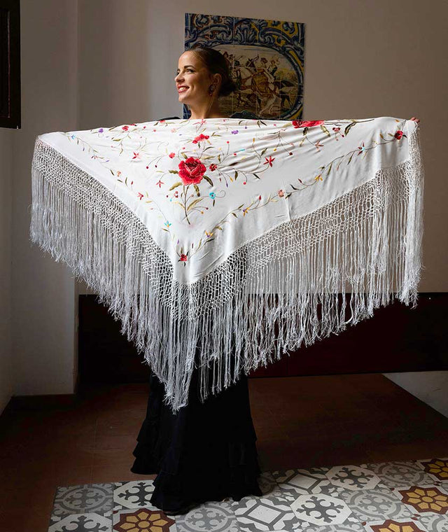 Mantón marfil bordado en seda natural con flores multicolor, medida y peso aproximado: 115 cm/0,250 kg.