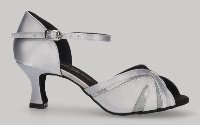 Zapato para baile latino y de salón en satén plata con tacón bajo