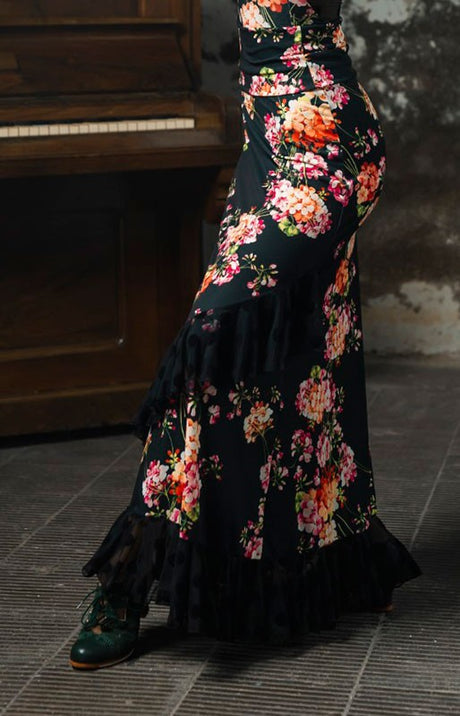 Jupe flamenco Granizo noire à volants imprimés floraux