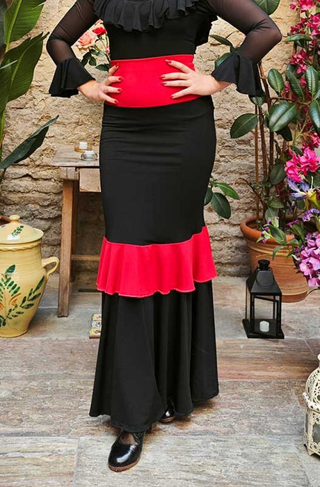 Jupe de flamenco ajustée noire et rouge jusqu'aux genoux