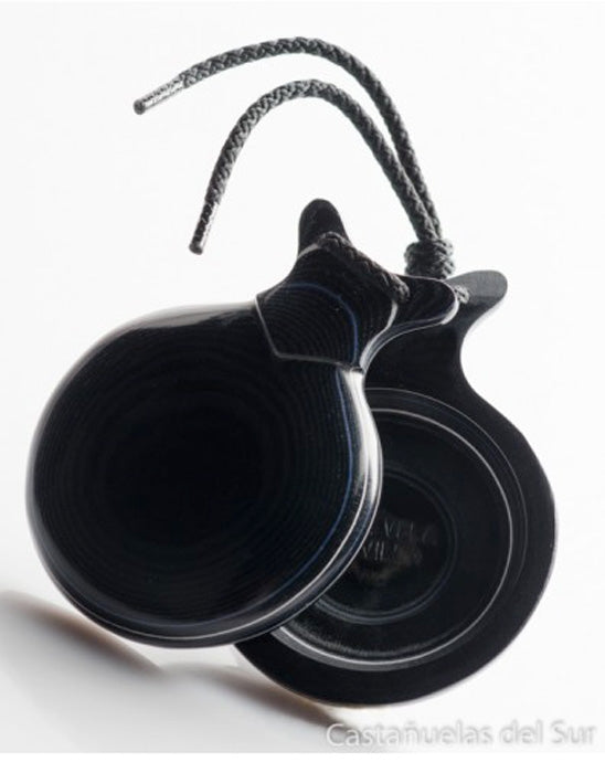 Castagnettes capricho en tissu noir avec veines bleues et blanches et double boîte. CASTAGNETTES DU SUD.