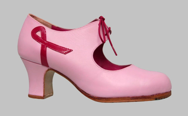 Chaussure de danse flamenco professionnelle en cuir rose avec décoration nœud en cuir verni fuchsia et lacets. ROBERTO GARRUDO. * Avec la vente de chaque paire du modèle caritatif, Roberto Garrudo fera don de 10 € à l'Association espagnole contre le cancer (AECC).
