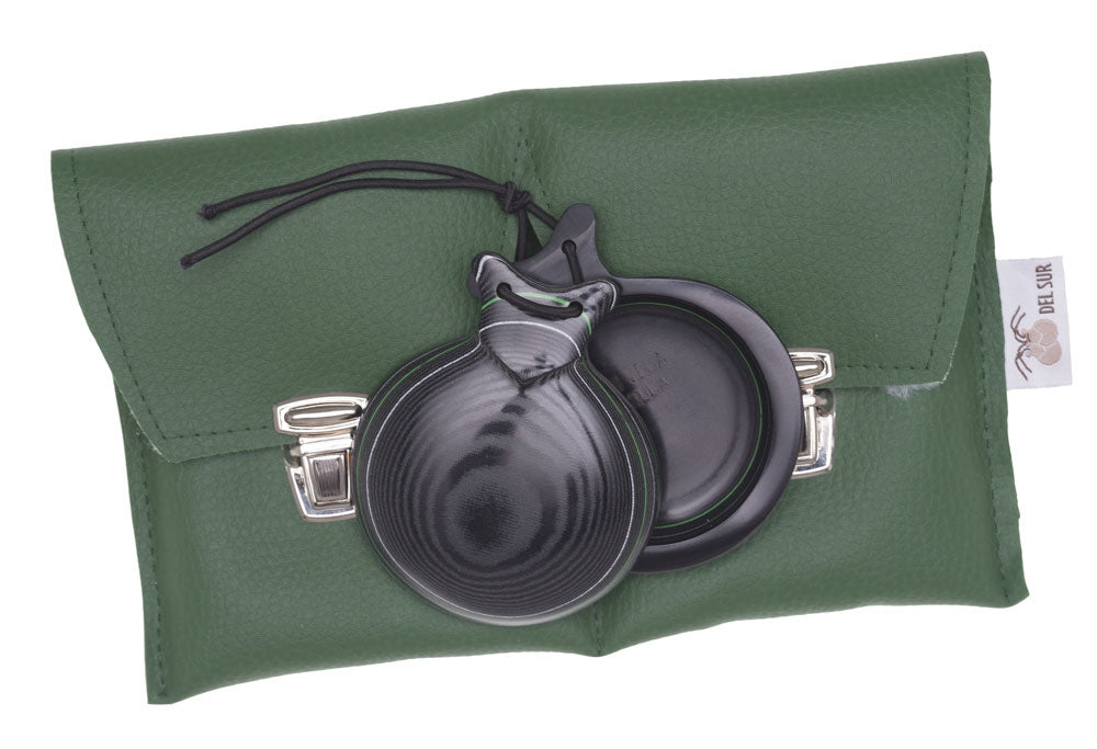 Castagnettes capricho en tissu noir avec veines vertes et blanches avec boîte normale "Spécial Jota". CASTAGNETTES DU SUD.