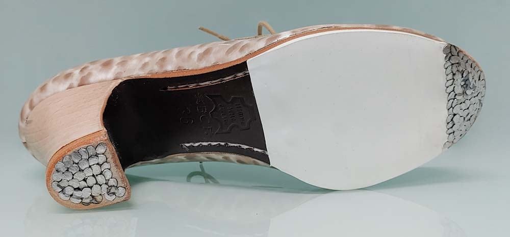 Chaussure de danse flamenco professionnelle en cuir verni beige nacré et daim beige