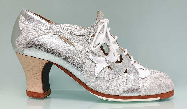 Chaussure de danse flamenco professionnelle dans une combinaison de cuir fantaisie argenté et blanc et de lacets. BÉGOÑA CERVERA. Nous fabriquerons ce modèle spécialement pour vous, le délai de fabrication sera d'environ 70-90 jours. Par conséquent, nous n'accepterons aucun échange ni retour. Avant de préciser la taille, assurez-vous de la choisir correctement. Remarque : Si vous souhaitez apporter des modifications aux fonctionnalités de ce modèle, veuillez nous en informer en écrivant à :zapatosdebaile@robertogarrudo.comet nous vous ferons un devis sans engagement.
