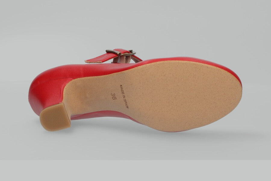 Chaussure de flamenco rouge avec boucle. SANS CLOUS. Ce modèle de chaussure de flamenco est le complément idéal de la robe de flamenco, communément appelée « Gitana » ou « Sevillana ». Il s'agit d'un modèle doté d'une semelle sans clous, il n'est donc pas conçu pour une pratique plus sophistiquée ou professionnelle du flamenco.