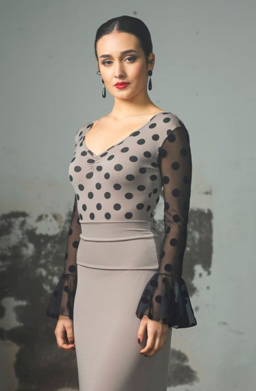 Body flamenco en maille extensible avec manches longues à pois et volant à l'ourlet. Couleur vison. DAVEDANS.