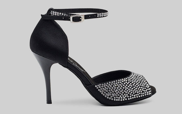 Chaussure de danse latine et de salon en satin noir avec strass en cristal sur l'empeigne, une sangle en strass en cristal et une boucle de talon. ROBERTO GARRUDO. * Kizomba * Tremper * Bachata * Tango