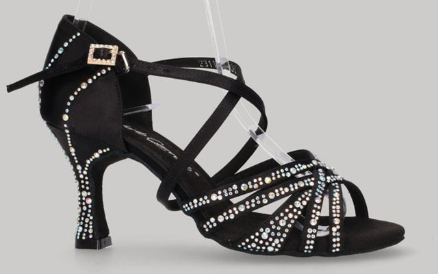 Chaussure de danse latine et de salon en satin noir avec strass en cristal sur l'empeigne et le talon, ornée de multiples perles sur le talon et d'une bride croisée sur le cou-de-pied. ROBERTO GARRUDO. * Kizomba * Tremper * Bachata * Tango