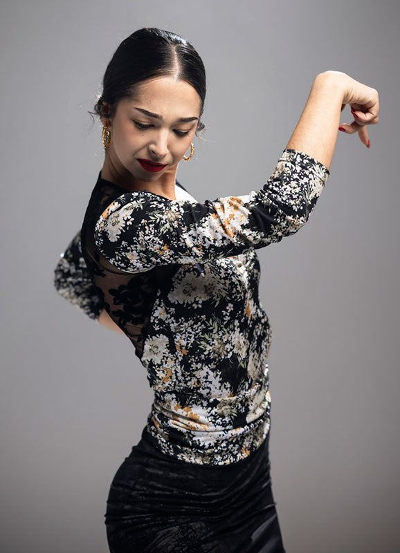 Body flamenco à manches longues avec fleurs blanches et dos en dentelle noire. DAVEDANS.