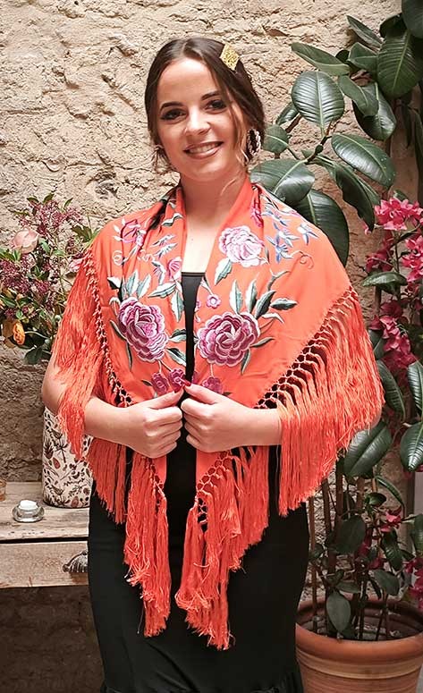 Châle orange brodé de fleurs et de roses colorées