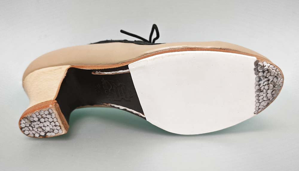 Chaussure de danse flamenco professionnelle combinée en cuir beige et ornements en cuir noir