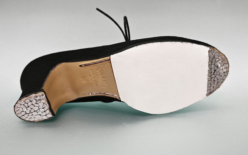 Chaussure de danse flamenco professionnelle combinée en daim noir et cuir noir avec lacets.