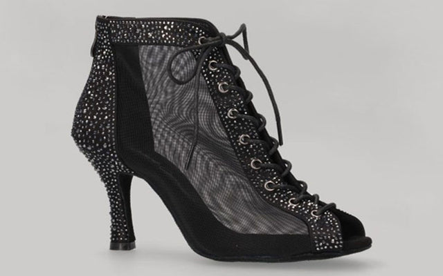 Bottines de danse de salon noires, élégantes en maille transparente et dotées d'une fermeture à lacets. Ornées de strass sur l'empeigne et le talon, elles sont parfaites pour faire sensation à chaque pas. ROBERTO GARRUDO. * Kizomba * Tremper * Bachata * Tango