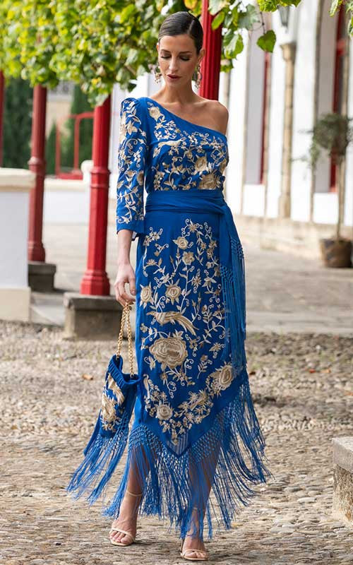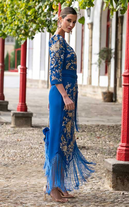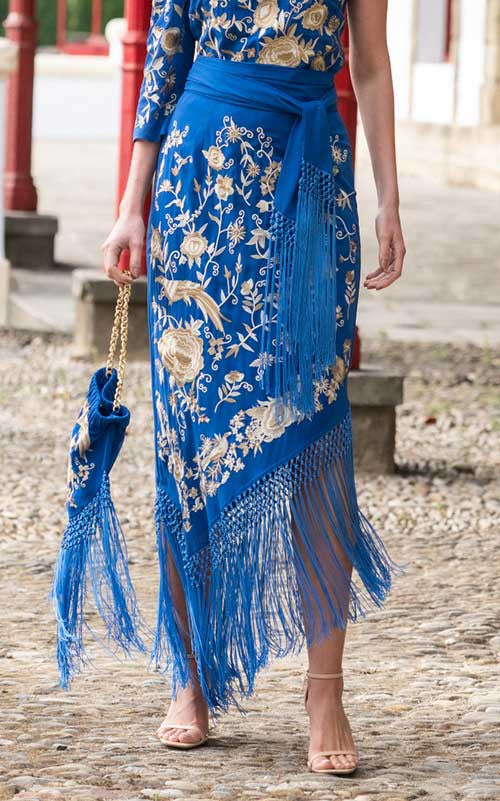 Jupe Solera Bleue Brodée de Fleurs Châle et d'Oiseaux dans les tons beiges avec franges en treillis à l'ourlet et sur la visière latérale.