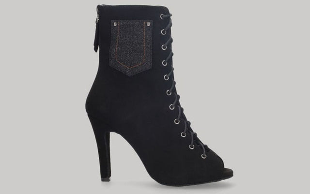 Zapato abotinado para baile de salón de ante negro con cordones y cierre de cremallera en talón