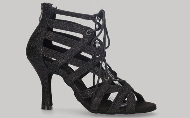 Zapato abotinado para baile de salón negro con tiras cruzadas con cordones y cierre cremallera en el talón