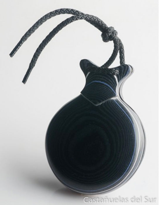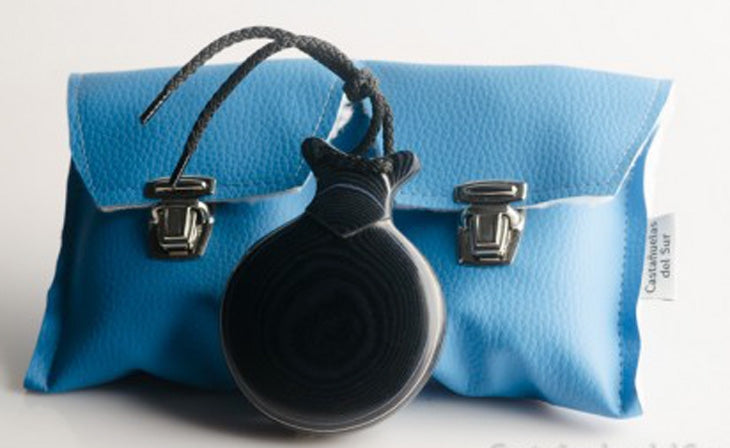Castañuela capricho tela negra veteada azul y blanca con caja normal. CASTAÑUELAS DEL SUR.