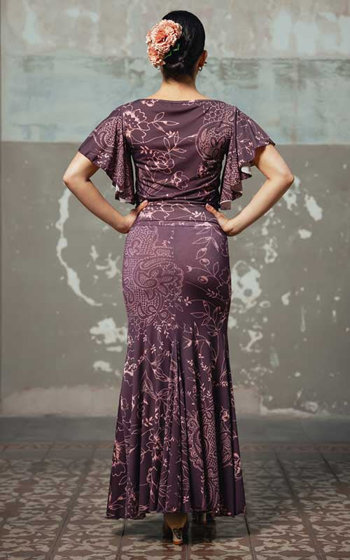 Falda de baile flamenco punto elástico negra con fajín estampada de flores, dos godets a cada lado y otro detrás en el centro.