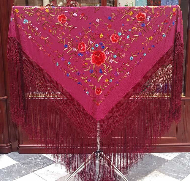Mantón Seda Color Burdeos Bordado a Mano 140 cm.
