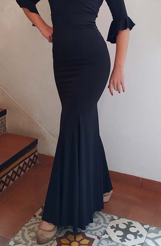 Falda de baile flamenco entallada a medio muslo con trincha doble de 4 palas de medio vuelo negra. Especial para bailar sevillanas. HAPPYDANCE.