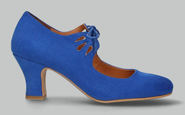 Zapato de flamenca de antelina azul Francia con cordones, forro y planta interior de piel, suela sintética sin clavos.