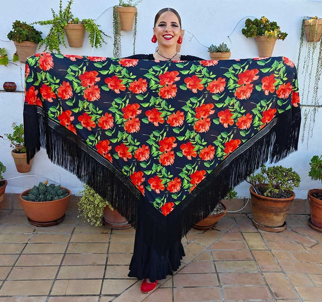 Mantón estampado de flores de doble tejido con estructura de pico y flecos en color negro de 25 cm. aproximadamente.