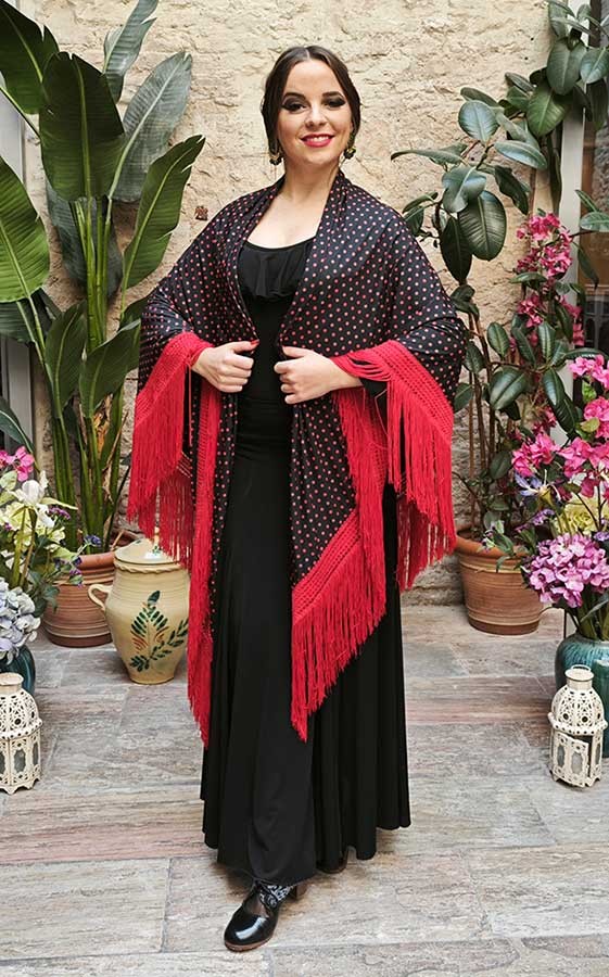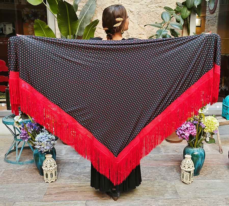 Mantón negro lunares con rojos de doble tejido con estructura de pico y flecos en color rojo de 25 cm. aproximadamente. HAPPYDANCE.