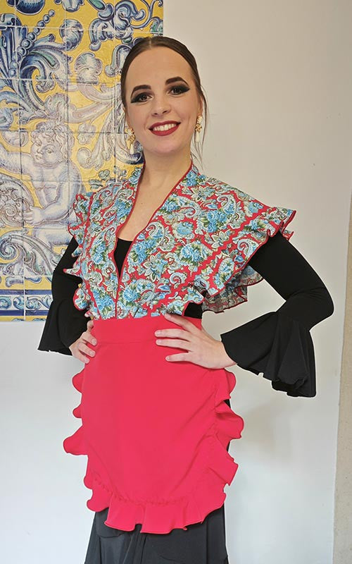 Conjunto Delantal y Mantoncillo Flamenco Rojo con Estampado de flores. ROBERTO GARRUDO.