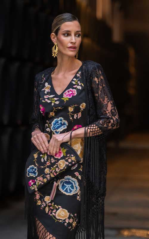 Chaqueta Crujía de encaje negra terminada en flecos enrejados en mangas y filo.
