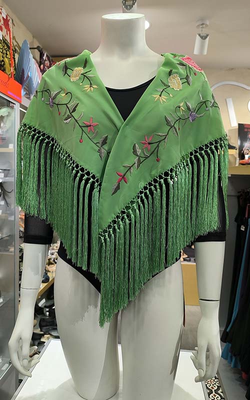 Mantoncillo verde manzana bordado con flores de colores y rosas rojas con enrejado y flecos al tono. ROBERTO GARRUDO.